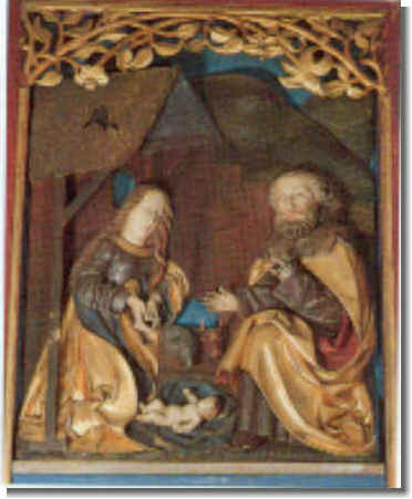 Jeder Künstler kann seinem Bild durch Größenverhältnisse und Anordnungen, mit Farben und Formen einen bestimmten Ausdruck verleihen. Das Dreieck ist eine wichtige Grundform. Es verbindet in seinen drei Eckpunkten Spannungen und gleicht verschiedene Kräfte aus. Diese Grundform beherrscht auch das obenstehende Bild von der Geburt Jesu am Marienaltar (4).
