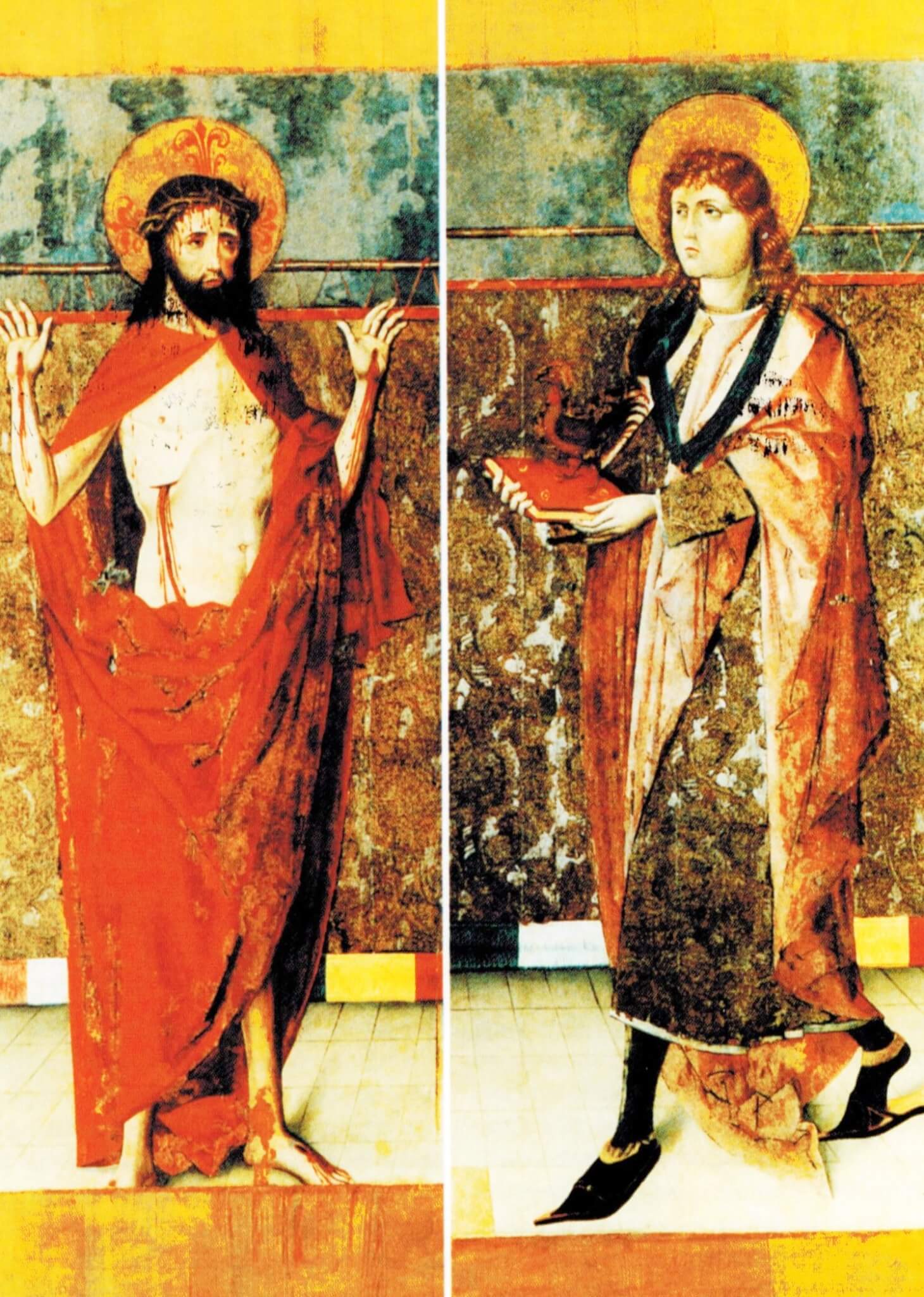 Ganz besonders gerne betrachte ich mir jedoch den Veitsaltar an der Nordseite, der ja vor etwa 20 Jahren renoviert worden ist. Schon allein die bunten Farben beindrucken mich sehr, dann Veit selbst als blondgelockter Jüngling in der Kleidung des 15. Jahrhunderts mit einem langen Ober- und Untergewand und spitzen Schuhen. In den Händen hält der seine Attribute, das Buch und den Hahn. Das Buch soll sicher die Heilige Schrift darstellen und ist ein Hinweis darauf, dass Veit auf das Wort Gottes vertraut. Veit geht auf Christus zu, der aus seinen Wundmalen blutet. Damit hat der Künstler ausgedrückt, dass Veit sein Vertrauen auf den Sohn Gottes setzt und sich unter seinen Schutz begibt.