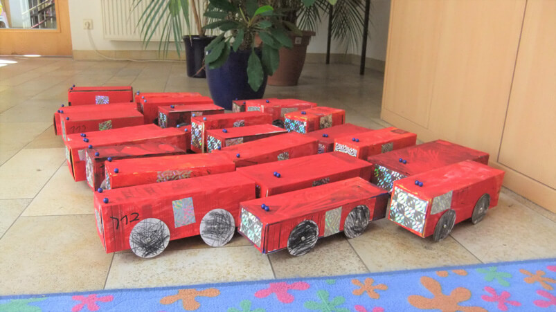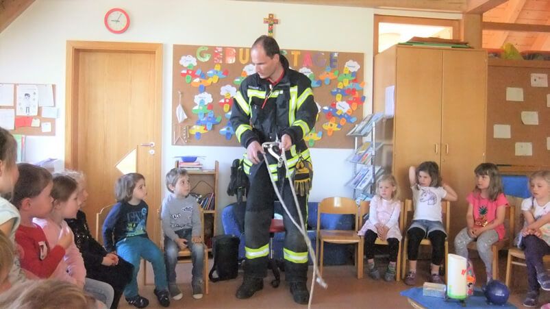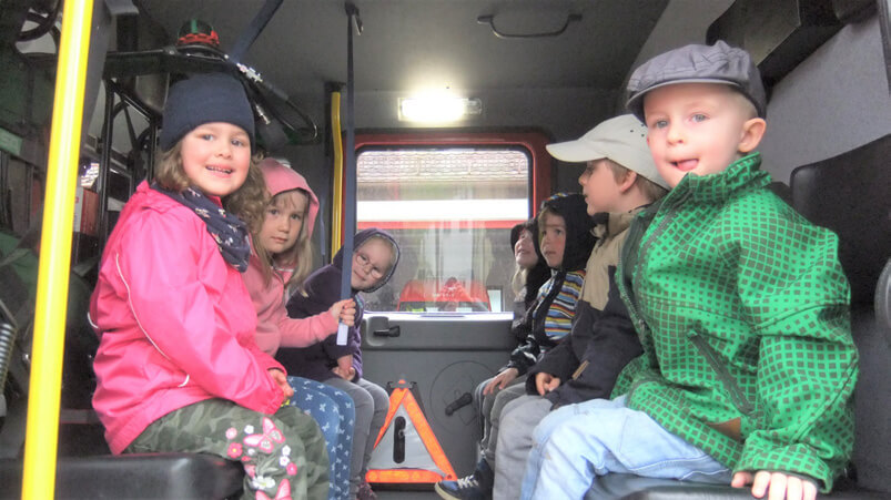 Die Eichhörnchengruppe hat sich die letzten Wochen intensiv mit dem Thema Feuerwehr beschäftigt. Wir haben eine Feuerwehrecke eingerichtet, in der wir einen Feuerwehr-Bewegungsparcours durchführen konnten. Ein echter Feuerwehrmann hat uns mit voller Montur in der Gruppe besucht. Außerdem waren wir zu Besuch im Feuerwehrhaus in Ottensoos. Dort durften wir die Gerätschaften und Anzüge ansehen, mit einem Schlauch spritzen und eine Rückfahrt mit dem Feuerwehrmannschaftsbus zum Kindergarten erleben. Wir haben Feuerwehrautos gebastelt und Feuerwehrbrote gefrühstückt.