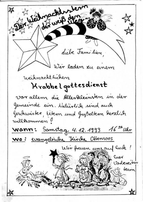 Angelika Ziegler-Lassauer fragte mich, ob ich nicht Lust hätte, bei einem Krabbelgottesdienst mitzumachen (so hieß die Kukiki am Anfang). So fand am 4.12.1993 das erste Mal diese Gottesdienstform für die Kleinsten in der Gemeinde statt. Vorbild war der Wichtelgottesdienst, den es in Lauf gab.