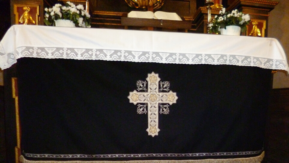 Außerdem hat sie die weißen Altardecken mit neuen Bordüren versehen und kleine Löcher mit einer Stickerei kaschiert!