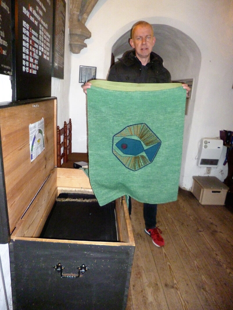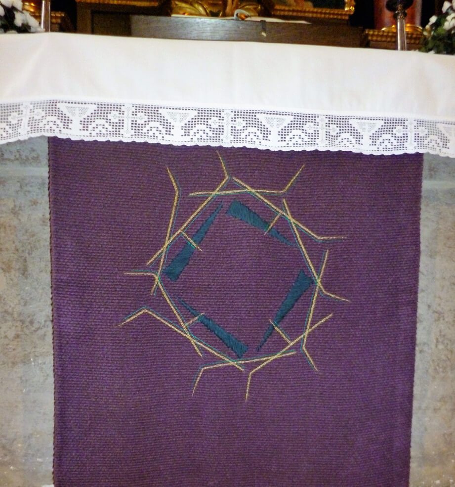 Wussten Sie, dass Christine Huth alle Paramente mit einem Klettband versehen hat, damit das Auswechseln schnell von der Hand geht? Früher mussten die Paramente mit vielen einzelnen Häkchen aus- und eingehängt werden.