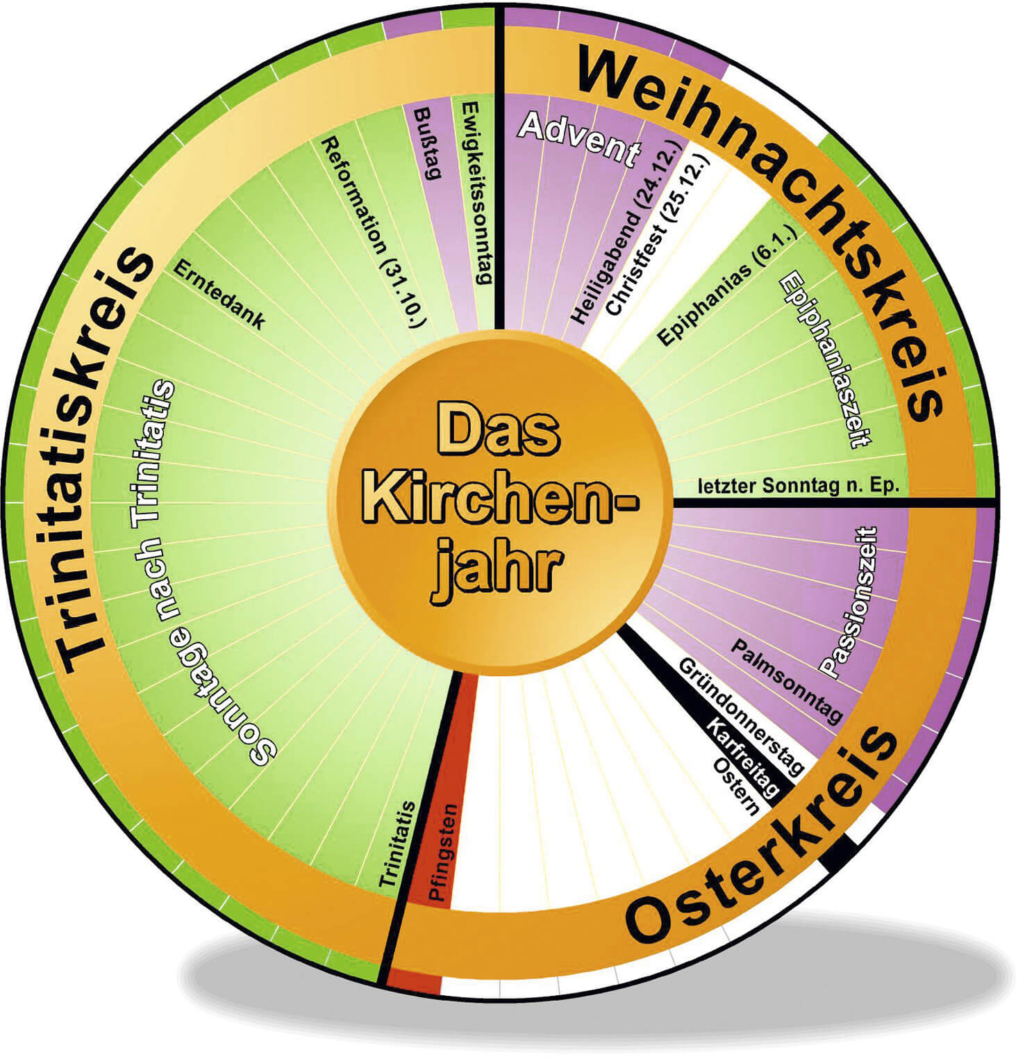Wussten Sie, dass im Gesangbuch unter der Nummer 910 ein liturgischer Kalender zu finden ist? Dort stehen für jeden Sonntag die passenden Bibeltexte und Lieder. Rechts neben jedem Sonntag findet sich auch die jeweilige liturgische Farbe.