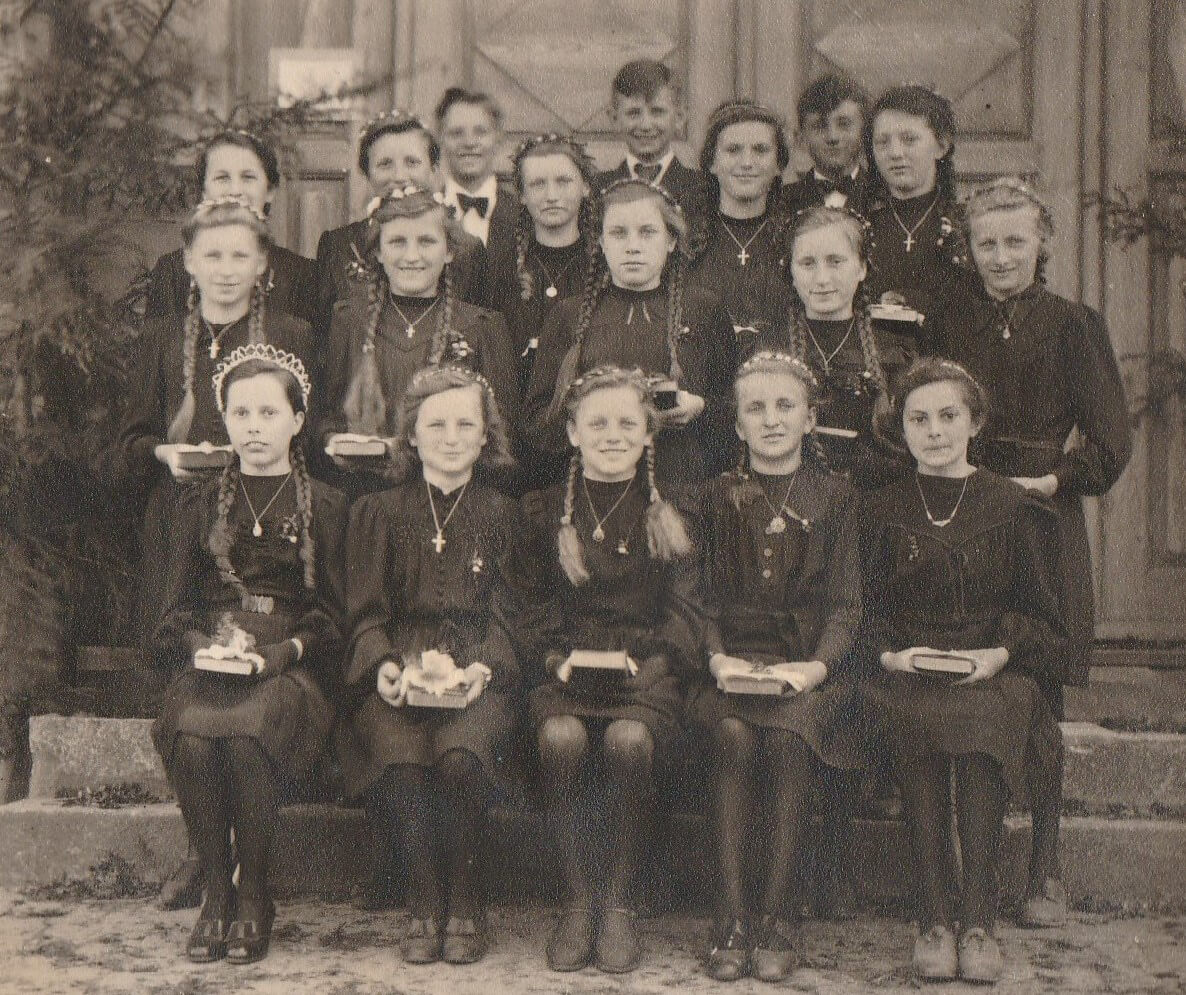 Konfirmandenjahrgang 1945; ganz links oben Gunda Ruder; ganz vorne zweite von rechts Frieda Falk