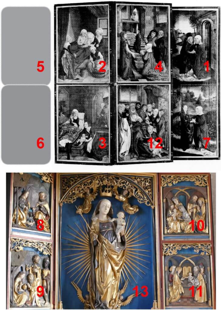 Der Altar zeigt den Zyklus des gesamten Marienlebens und die Tatsache, dass dabei die Ankündigung der Geburt Jesu durch den Engel fehlt – diese ganz zentrale Geschichte der Auserwählung Marias – ist ein weiterer Hinweis auf das Fehlen des linken Standflügels.