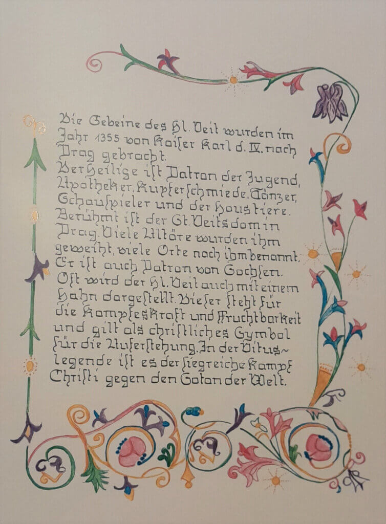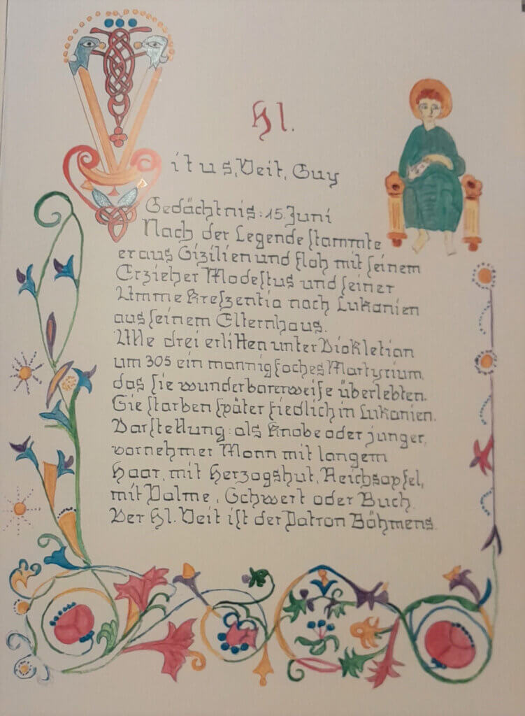 Bei der Kirchenführung am „Tag des offenen Denkmals“ überreichte Marion Utzat aus Schönberg ein tolles Buch, das sie selbst gezeichnet und geschrieben hat zum Thema der 14 Nothelfer. Sie sagte, dass sie damit das Ehrenamt würdigen will und hat das Buch (etwas größer als DIN A 3 Format) der Kirchengemeinde Ottensoos gewidmet. Hier die beiden Seiten zum Heiligen Veit.