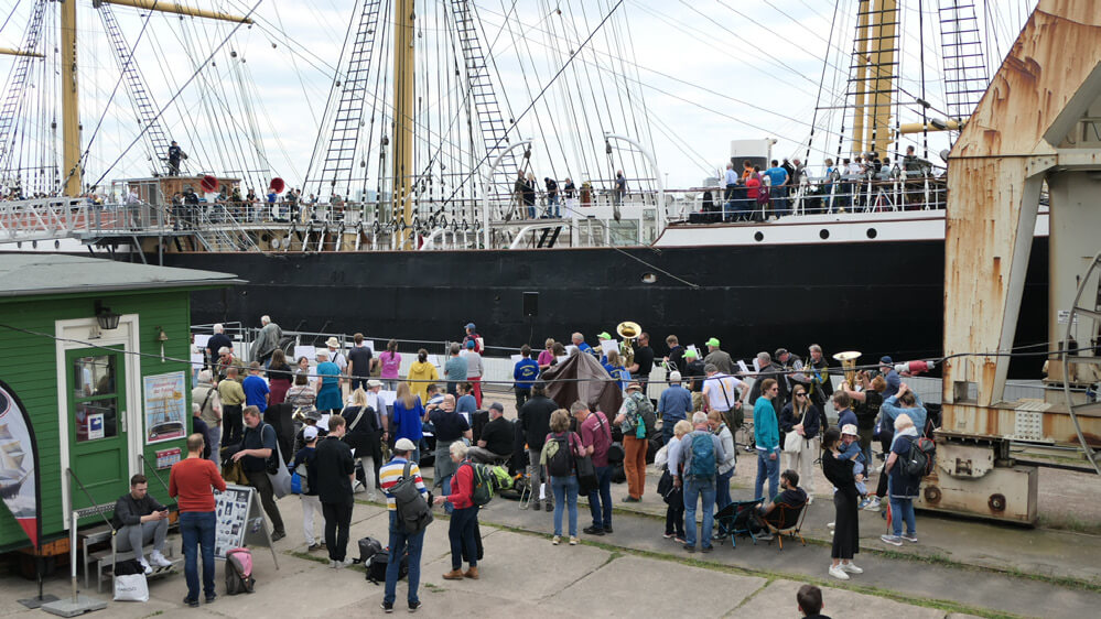 Zeitgleich gab es sieben Themenveranstaltungen für jeweils ca. 500 Bläser zu „Hamburg klingt“. Einer unserer Bläser spielte hier an der Viermastbark Peking mit, dem Museumsschiff des Hafenmuseums. Aus dem exklusiven Notenheft nur für diese Veranstaltung wurde unter anderem „Auf der Reeperbahn nachts um halb eins“, „Anchors aweigh“, der Song der US Navy, und „The Wellermann Song“ gemeinsam musiziert.